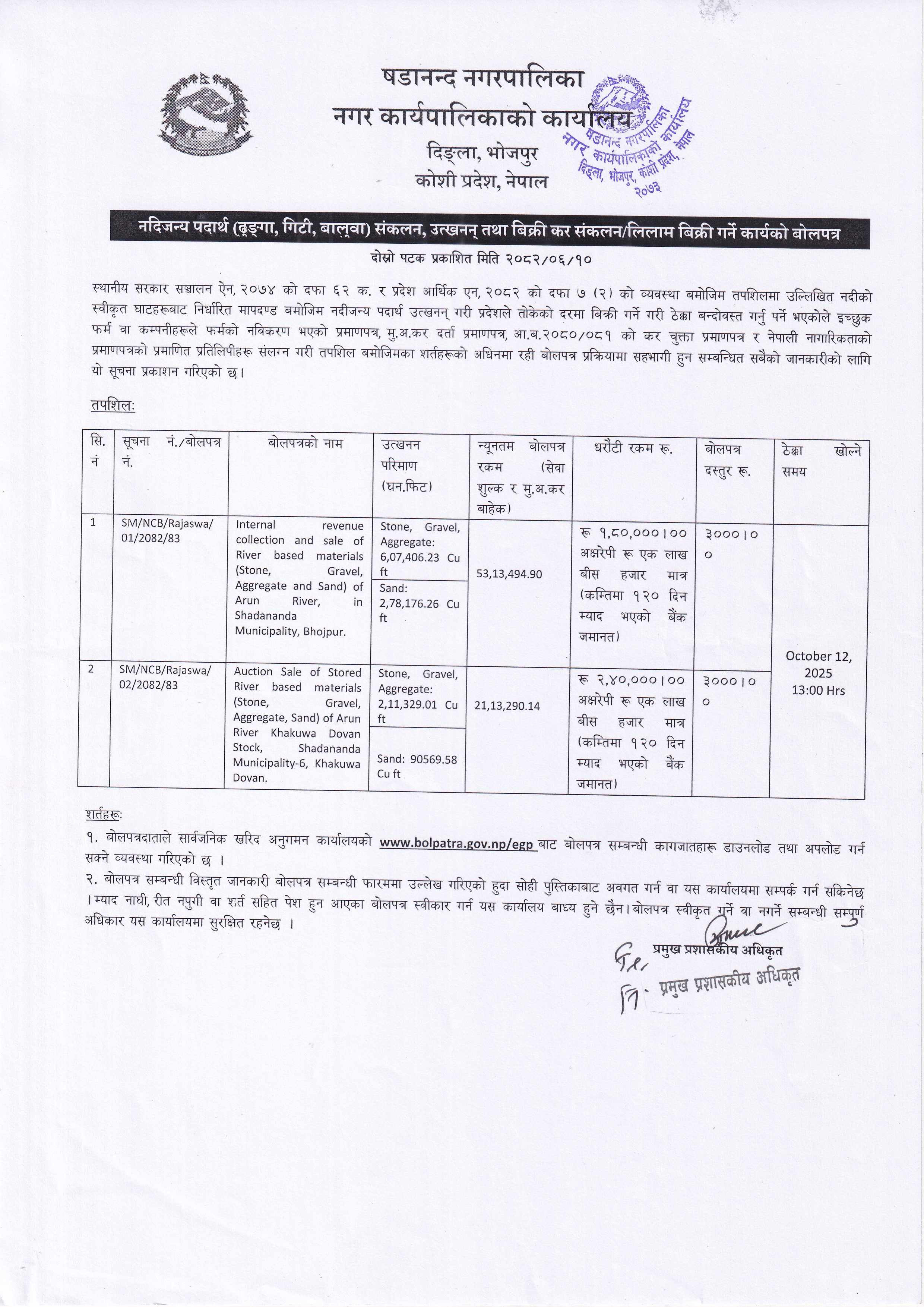 » नदिजन्य पदार्थ (ढुङ्गा, गिटी, बालुवा) संकलन, उत्खनन् तथा बिक्री कर संकलन/लिलाम बिक्री गर्ने कार्यको बोलपत्र सम्बन्धी दोस्रो पटकको सूचना !!!