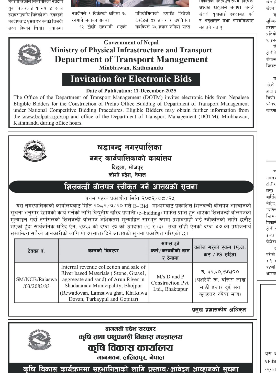 नदिजन्य पदार्थ (ढुङ्गा, गिटी, बालुवा) संकलन, उत्खनन् तथा बिक्री कर संकलन/लिलाम बिक्री गर्ने कार्यको बोलपत्र स्वीकृत गर्ने आशयको सूचना !!!
