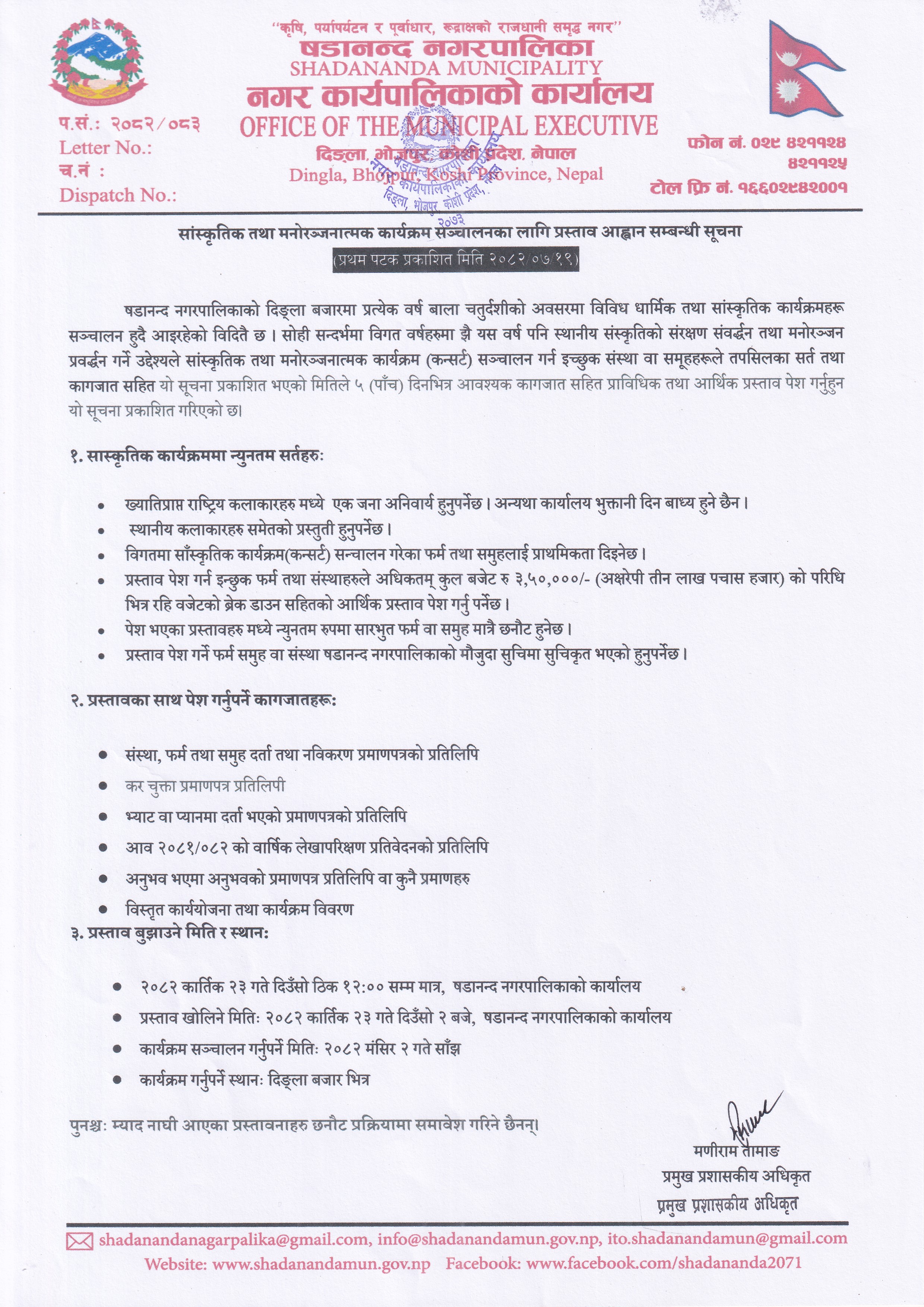 सांस्कृतिक तथा मनोरञ्जनात्मक कार्यक्रम सञ्चालनका लागि प्रस्ताव आह्वान सम्बन्धी सूचना !!!