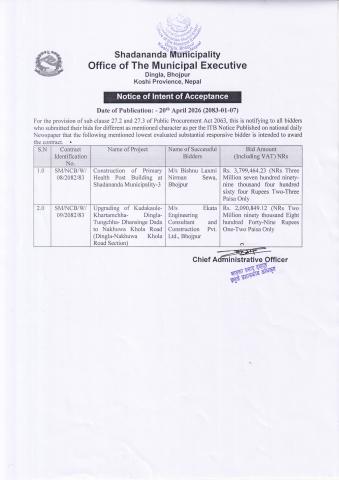 Home » बोलपत्र स्वीकृत गर्ने आशयको सूचना ! ( स्वास्थ्य चौकी भवन षनपा ३ खार्तम्छा, कुदाककाउले खार्तम्छा दिङ्ला तुङ्गेछा धनसिङ्गेडाँडा देखी नखुवा खोला सडक स्तरोन्नती )