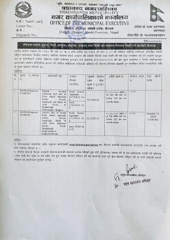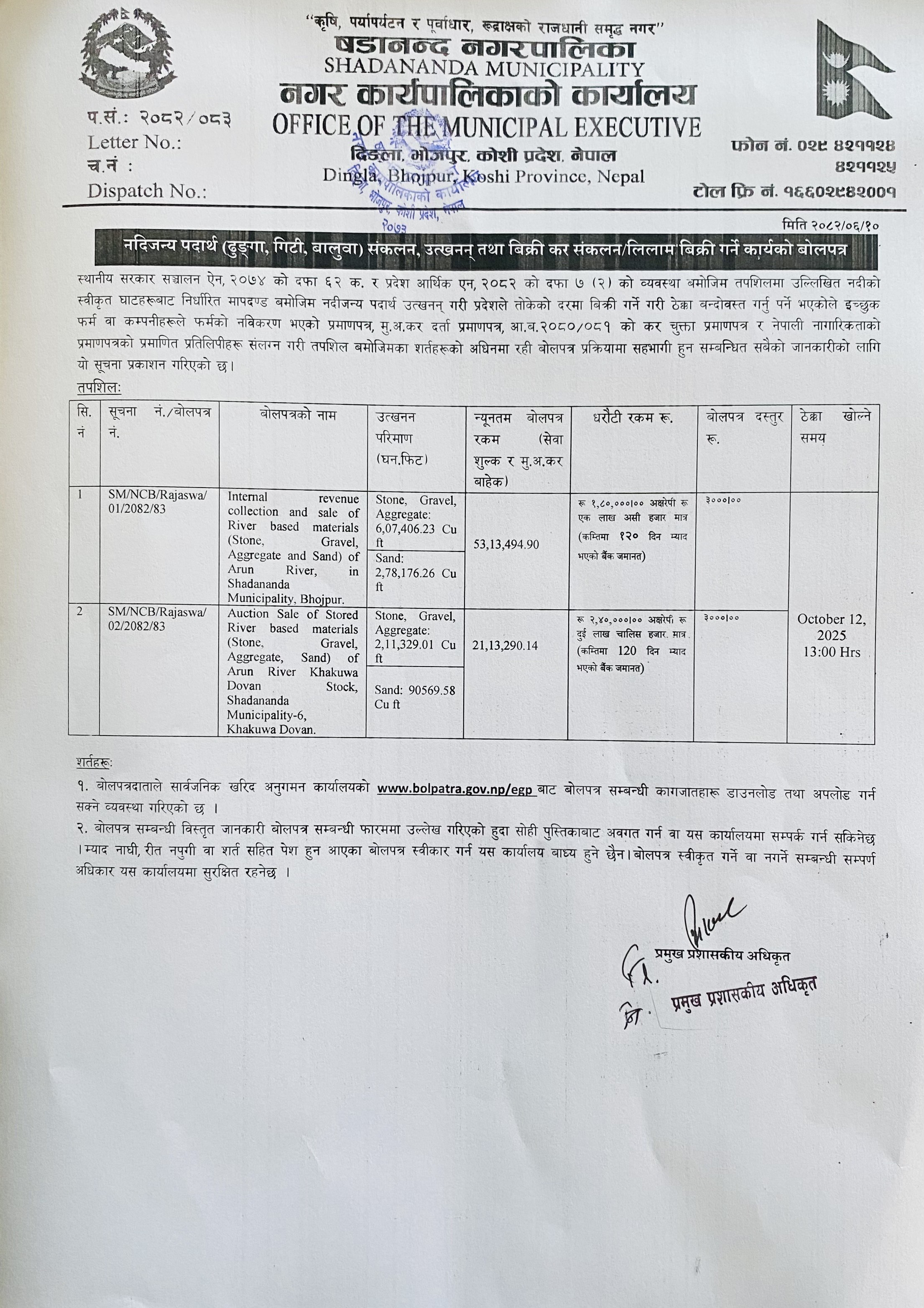 नदिजन्य पदार्थ (ढुङ्गा, गिटी, बालुवा) संकलन, उत्खनन् तथा बिक्री कर संकलन/लिलाम बिक्री गर्ने कार्यको बोलपत्र सम्बन्धी सूचना !!!