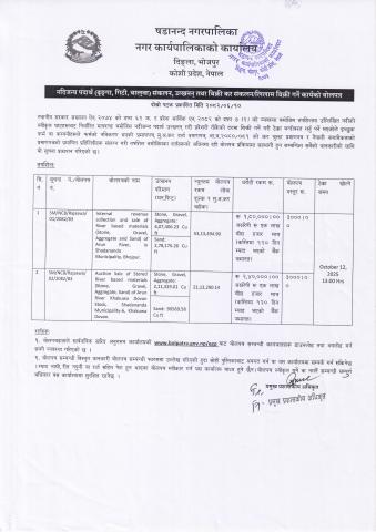नदिजन्य पदार्थ (ढुङ्गा, गिटी, बालुवा) संकलन, उत्खनन् तथा बिक्री कर संकलन/लिलाम बिक्री गर्ने कार्यको बोलपत्र सम्बन्धी दोस्रो पटकको सूचना !!!