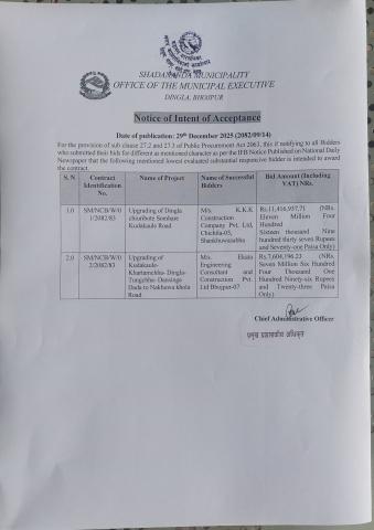 दिङ्ला चिउरीबोटे, सोमबारे कुदाककाउले सडक र कुदाककाउले खार्तम्छा दिङ्ला तुङ्गेछा धनसिङ्गेडाँडा देखी नखुवा खोला सडक स्तरोन्नती तथा निर्माण कार्यको लागि बोलपत्र स्वीकृत गर्ने आशयको सूचना !!!